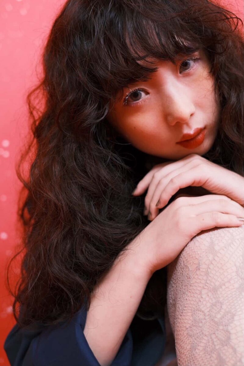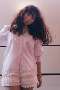 curly hair:tabuchi 自身のクセを活かし、ありのままの姿を表しました。ふと風が当たると出てくる細かい毛は人生の重なりをイメージし、花の人生を創造しました。 make:tenma色使いはドライフラワーをイメージ。花言葉は永遠花の美しさとどこか寂しげな印象に fashionデザイン性のあるブラウスとレースのショートパンツで花びら表現してます。モデルさんが元々もってるガーリーさも引き出しつつ、セクシーさも入れて少し冒険してみました。